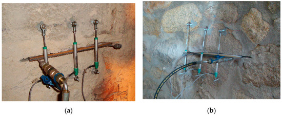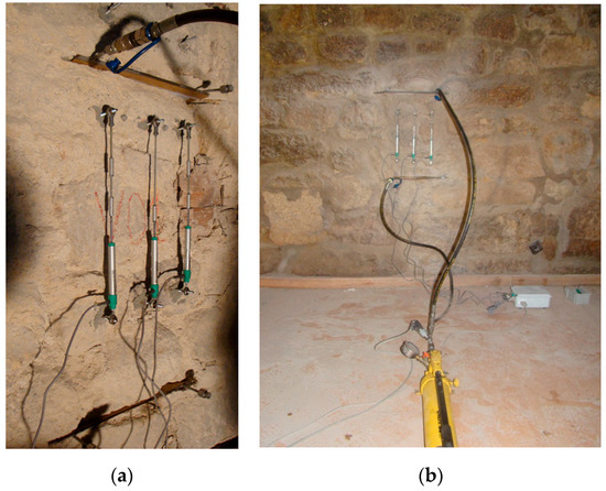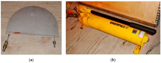 - Flat-jacks: BOVIAR MPA—A semicircular flat-jacks, with dimensions 350 × 260 × 4 mm, and maximum service pressure 60 bar, Figure 11a. According to the calibration certificate, a km value of 0.902 was assumed for all the flat-jacks used in this campaign.
