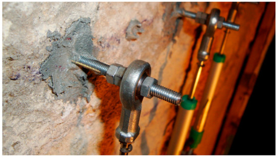 - Displacement transducers: GEFRAN displacement transducers, with a 50 mm stroke, provided with self-aligning ball-joints. The displacement transducers were attached to the masonry by means of 5 mm threaded rods, applied with chemical anchor, at a depth of 50 mm, Figure 12.