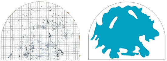 Figure 13 shows the single flat-jack testing. As presented, three vertical reference alignments were considered. In order to estimate the effective flat-jack loaded area, the procedure proposed by Gregorczyk and Lourenço [29] was adopted: a sheet of carbon paper, sandwiched between two sheets of ordinary paper, was placed between the jack’s surface and the surrounding masonry (this set was prepared in the shape of the jack). In this way, the areas where the jack comes into contact with the masonry are marked in the paper and can be measured (Figure 14).
