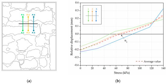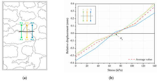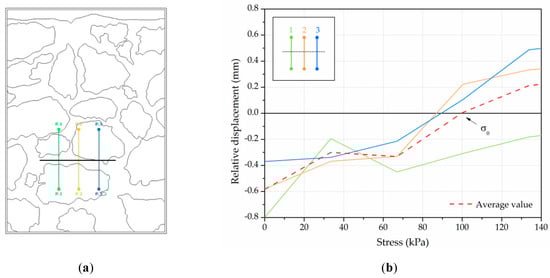 Single flat-jack test OS1: (a) identification of the vertical alignments; (b) evolution of the relative displacements for each vertical alignment and estimation of the in-situ stress.