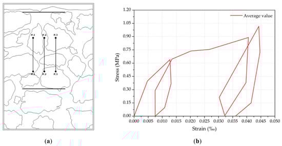 Double flat-jack test AD1: (a) identification of the vertical alignments; (b) average stress-strain curve.
