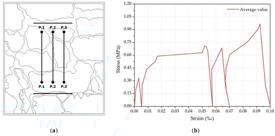 Double flat-jack test OD1: (a) identification of the vertical alignments; (b) average stress-strain curve.