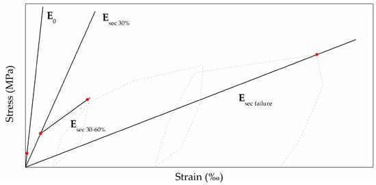 The Young’s modulus was obtained through graphical analysis, taking into account the slope of the stress-strain curves, namely the slope of the secant stiffness. Different portions of the curve (corresponding to different percentages of the maximum strength) can be analyzed, leading to different values for the Young’s modulus. Figure 22 presents the different options for evaluation of the Young’s modulus that were considered in this paper.
