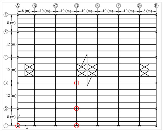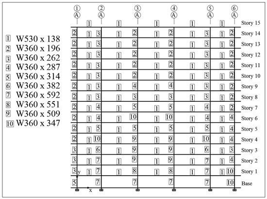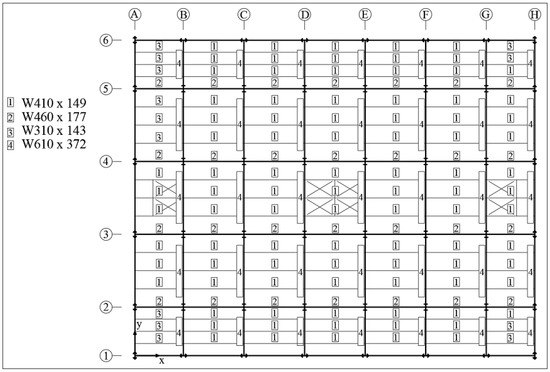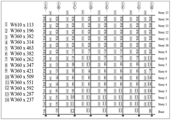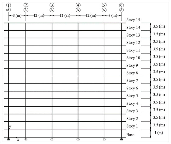 The case study steel structure was developed for two purposes: (1) to assess the implications of using moment resisting frames on the progressive collapse response, and (2) to understand the effect of analysis method on the structural response. The fifteen-story case study building is considered regular as defined in Section 3-2.11.1.1 [2], which permits the use of the linear elastic analysis method. The framed steel structure consists of 7 × 5 panels on floor plan view. The structural configuration for both plan and elevation locations are shown in Figure 1 and Figure 2. The exterior and interior spans along the x-axis are 8 m and 10 m, respectively, whereas the exterior and interior spans along the y-axis are 8 m and 12 m, respectively.