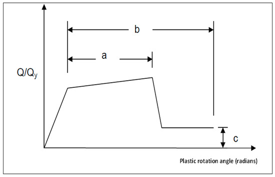 The general configuration of the beam force–deformation relationship is shown in Figure 6 [1]. The rotation angles, a and b, and the residual strength, c, depend on the cross-section used as shown in Table 2.