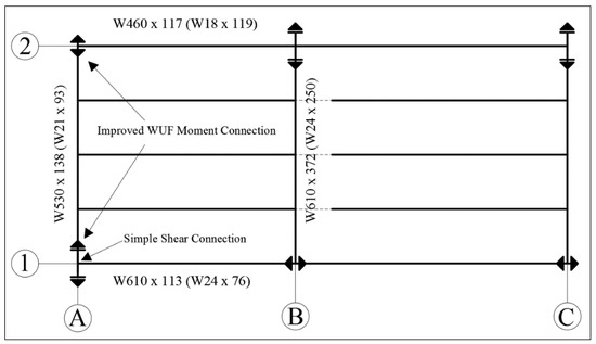 In order to demonstrate how the non-linear hinge properties for flexural members were calculated in the case study, the beams framing into the the notionally removed A1, shown in Figure 7, are examined. Welded unreinforced flange-bolted (WUF) moment connection are used for all moment resisting frames.