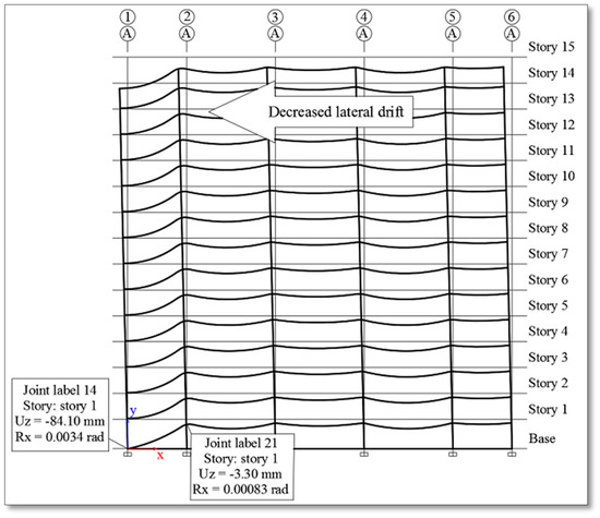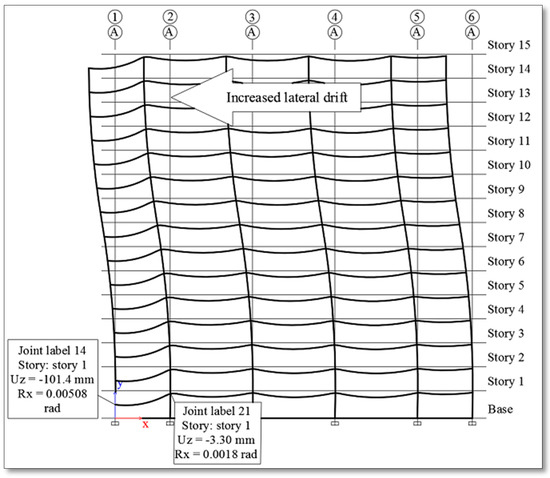 Deformation response of the structure at grid line A due to the notional removal of column A1 when moment frames are located at perimeters and along grid lines B, C, D, E, F and G (load case 16, non-linear dynamic analysis).