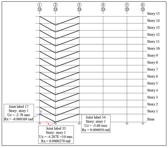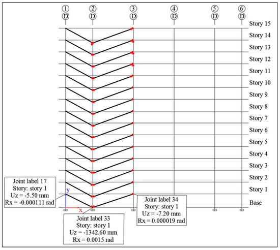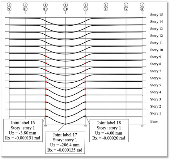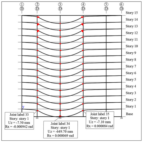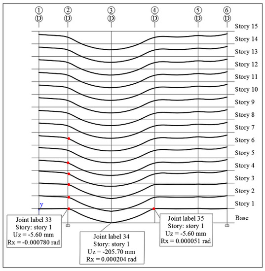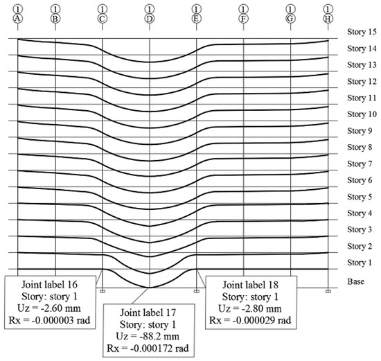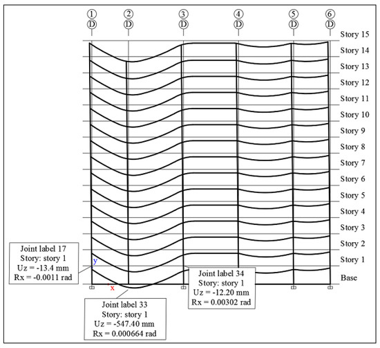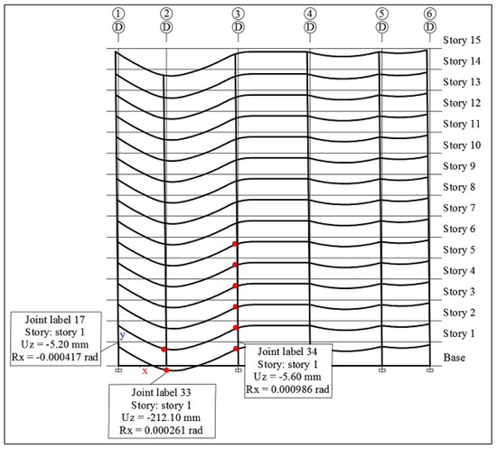 Displacement at notionally removed column D2 (part of grid line D) when moment frames are located at perimeters and along grid lines B, C, D, E, F and G (linear static analysis case 17).