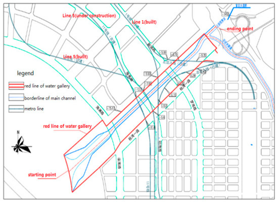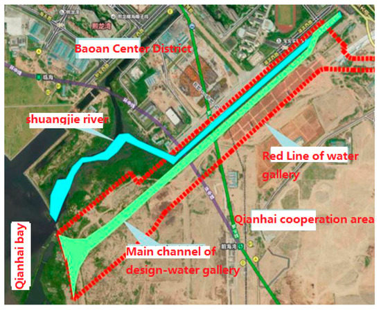 This study is based on the Shuangjie River water gallery project in Shenzhen, and the specific layout planning of the project is shown in Figure 1. The project mainly aims to transfer the main channel of the existing double-boundary river toward the south by 35 m. The water gallery will intersect with the Qianhai car access road after the transfer, as shown in Figure 2.