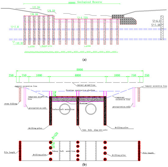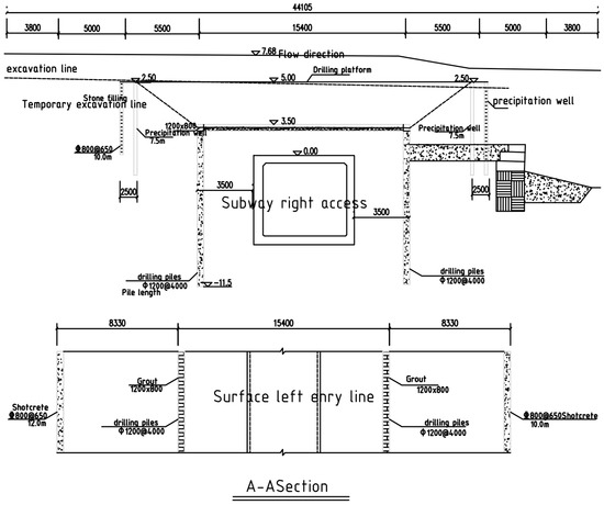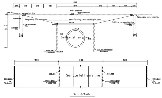 The excavation project adopts a staged construction method with a length of 10 m. The first excavation of the ground elevation control is above an elevation of 1.0 m (within 5 m), which forms a temporary construction platform. Bored piles (the pile top elevation is approximately −2.0 m) are set on both sides of the tunnel (with a 3.5 m interval). The diameter of a pile is 1.2 m, and its spacing is 3–4 m. The piles exhibit a pull-up effect. The soil below the elevation of −2.0 m is grouted and reinforced, and the second excavation is conducted. The location of the second excavation reaches the design of the main groove bottom elevation (approximately −2.0 m elevation). The reinforced concrete cover is poured on top of the cast-in-place pile, and the cast-in-place pile is consolidated with the cover to reduce bulge deformation. A typical section of the subway is shown in Figure 3.
