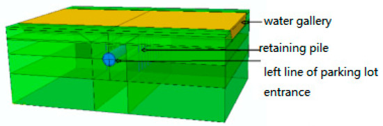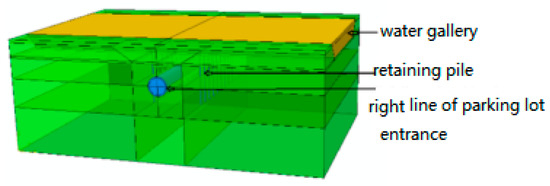 To analyze the influence of the water gallery construction on the safety performance of the existing subway tunnel under the designed protection scheme, the initial numerical simulation model considers the geological conditions of the tunnel in the Qianhai parking lot before excavation. In particular, the parking lot’s entrance and exit were first simulated during the construction process, and then the construction of the water gallery was simulated.