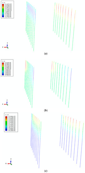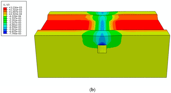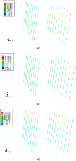 Deformation cloud of the right retaining pile. (a) x direction; (b) y direction; (c) z direction.