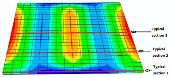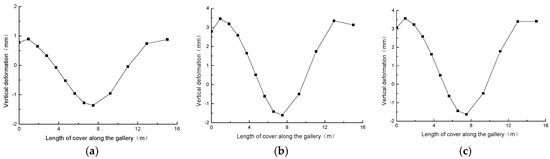 The cover, which uses reinforced concrete material for subway tunnel protection, has a thickness of 600 mm. The left lane of the parking lot was 2.83 m from the underside of the reinforced concrete deck. The right tunnel dome was 3.43 m from the underside of the deck. To analyze the cover deformation, three typical cross-sections of the cover were used, as shown in Figure 9. The deformation curves of the three sections of the upper tunnel cover are shown in Figure 10 and Figure 11.