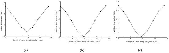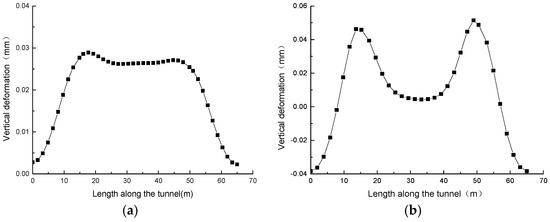 Figure 16 presents the vertical deformation curve of the subway tunnel vault along the tunnel under the influence of the water gallery construction. As shown in the figure, the maximum uplift of the arch of the left circular tunnel was 0.029 mm, and was located at the intersection of the water gallery shore and the left tunnel. The middle position had an evident straight section, and the length of the straight section was the same as the length of the cover plate. The minimum bulge in the straight section was 0.025 mm. This condition shows evident inhibition of the tunnel vault cover. The maximum uplift of the right tunnel vault was 0.05 mm, this was also located at the intersection of the water gallery bank and the left tunnel. An evident concave section was observed in the reinforced concrete cover position. The minimum amount of bulge in the middle of the square tunnel was 0.005 mm, which is considerably lower than the minimum bulge of the straight section of the circular tunnel. This shows that the inhibition of the reinforced concrete cover of the square tunnel uplift was better than that of the circular tunnel. This finding is attributed to the fact that the shape of the cover was the same as that of the square tunnel, and that the force synergy was better than that of the circular tunnel. In addition, the crown of the square tunnel vault that covered the edge location of the uplift was considerably larger than that of the circular tunnel. Therefore, the cover plate should be embedded into the interior of both sides of the water gallery to ensure the anti-raising effect of the cover plate and retaining pile in the actual engineering design and construction.
