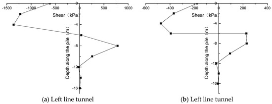 As shown in Figure 14 and Figure 15, the maximum shear force value of the retaining pile on both sides of the left circular cross-section subway tunnel was 1.35 MPa and appeared at a position approximately 1 m above the tunnel dome. Two evident cases of shear force sign mutation were observed. The mutation location depended on the center of the circular section, and the maximum value after the mutation depended on the bottom of the circular section. The maximum shear value of the retaining pile on both sides of the right tunnel was 0.49 MPa, and the maximum value appeared in the position where the direction tunnel vault was located. A clear two-value shear force sign mutation was observed on the right line, for which the first mutation was located at the level of the square tunnel center. When the curves of the shear forces on the two sides of the two retaining sections were compared, the shear force of the retaining columns beside the square tunnel was found to be considerably smaller than that of the circular tunnel. The maximum shear value of the retaining pile on both sides of the square tunnel was 36.3%. Therefore, the existing protective measures were safer and more suitable for square tunnels than for circular tunnels, in terms of the shearing force of the retaining pile.