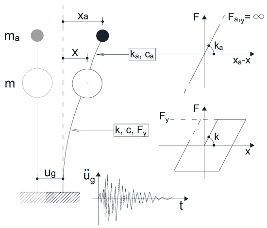 The system represented in Figure 1 allows to consider the coupled behavior of the main structure and NSC and can result more appropriate than systems generally adopted in similar studies which are often based on the dynamic analysis of two uncoupled single-degree-of-freedom (SDOF) systems in series [20,21]. As matter of fact, the latter systems are based on the simulation of a SDOF system representing the main structure whose response is, subsequently, considered as the ground motion for the secondary SDOF system which simulates the NSC. Such a study can result in accurate prediction if the NSC-to-structure mass ratio is quite small (i.e., ma/m→0) and thus the mass ma does not influence the dynamic response of the main structure. For sake of generality, the present study does not consider this approximation and a system of coupled equilibrium equations is actually solved by means of a piecewise approach based on the Newmark-beta numerical algorithm [22]. This algorithm is used in order to handle nonlinearities in the dynamic response of the system