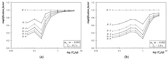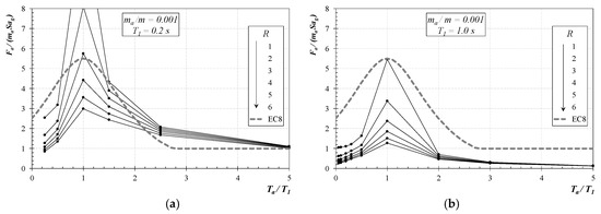 Figure 5 reports the (mean) values of RF for the cases of T1 ∈ {0.2 s; 0.5 s} and mass ratio equal to 0.001: Ta/T1 ratio ranges up to significantly high values, owing to the short period of the main structure and the assumed range of variation of the secondary system periods (Section 2). Therefore, the curves (one for each value of the R factor) clearly highlight the following “properties” of RF: