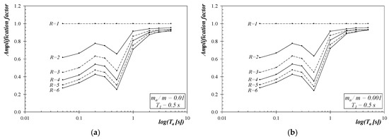 Moreover, Figure 4 consists of two diagrams reporting AF for the same fundamental period T1 = 0.5 s and two different mass ratio ma/m. It confirms that mass ratio is almost irrelevant for the resulting response, at least if it is kept lower than 0.01.