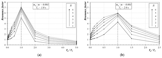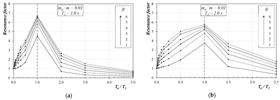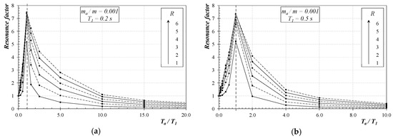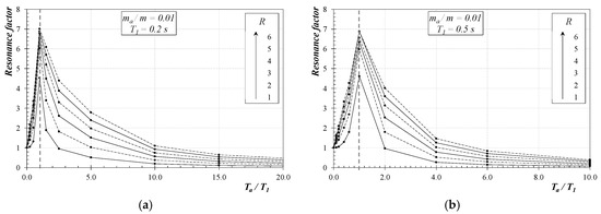 The resonance factor (RF) can obtain a more compact and representative representation of the huge amount of numerical results obtained in the parametric analysis herein performed. As shown in Equation (6), the denominator of RF is clearly related to the elastic spectral pseudo-acceleration of the main structure for the period T1 and the damping ratio ξ, thus the possible analytical description of RF in terms of the other relevant parameters would straightforwardly lead to the quantification of Fa which is the numerator in Equation (6).