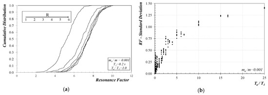 Finally, since only the mean values of the main numerical results have been represented in the previous figures, further aspects dealing with the record-to-record variability of the RF need to be addressed. Therefore, Figure 9 reports both cumulative distribution and standard deviation of the RF obtained for the structural systems analyzed in this study. As for the former, the curves (conforming to a lognormal distribution) plotted in Figure 9 show that the R only influences the median value of RF. As for the latter, the standard deviation is mainly controlled by the period ratio Ta/T1.