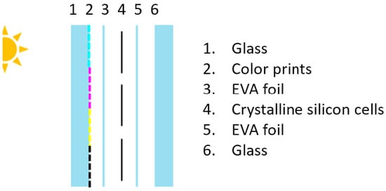 Multi-coloured glass-glass (MCGG) and crystalline silicon cell (c-Si) PV laminates are an approach to overcome some of these aforementioned issues and achieve aesthetically pleasing, yet technically and economically viable building integrated PV systems, by utilising market-proven technologies which also retain high market potential in the future. This solution combines translucent digital ceramic print technology [,,] with existing mainstream technologies, notably crystalline silicon cells and glass-glass sheets (see Figure 1).