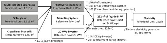 Figure 3 presents functional units of each product along the supply chain of the BIPV system, leading to the generated electricity as final product. The laminate is assessed by applying the “cradle to gate” approach. The system boundary includes the material and energy flows of the upstream processes for the laminate. Nevertheless take back and recycling of a laminate is already included. The electricity is assessed by applying the “cradle to cradle” approach. The system boundary includes all processes for laminate production, including production of the Balance of System (BOS) [], such as mounting system, cabling, and an inverter. Furthermore, this considers the transportation, installation, cleaning, and maintenance of the PV installation, and its end of life. To obtain the environmental impact per 1kWh electricity generated using the model in this study, the total environmental impact of the façade (including water and waste water from cleaning) is simply divided by the total electricity generated during its lifetime.