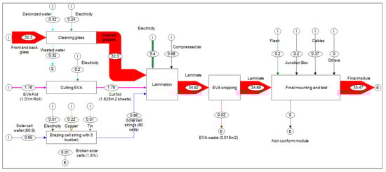 Material (kg) and energy (kWh) flows to produce 1.615 m of a multi-coloured glass-glass PV laminate with 60 crystalline silicon cells, a junction box, and connecting cable. Arrowheads labelled I denote and import flow, indicating an input material or energy, while those labelled E denote an export flow, indicating a waste or loss. Data was derived from literature [] and updated with material balance data and measured electricity consumption of the production steps and supporting processes provided by a German PV module manufacturer (courtesy of GES Gebäude- und Energiesysteme GmbH, 2018).