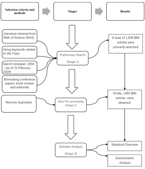 Through refining and duplicate checking, 1455 articles on BIM were obtained. The specific data collection process is shown in Table 1.