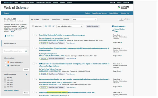 Thirdly, only English articles and reviews were selected. To ensure the comprehensiveness and reliability of the results of literature review, the literature referred to was limited to journals, excluding book reviews, letters, news reports and conference abstracts. This is because journal papers are usually peer-reviewed, and can be considered to provide more comprehensive, robust and superior quality of information than other types of publications. In total, 3033 articles on BIM were retrieved for the first time, with the database interface shown in Figure 2.