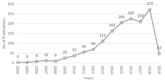 Secondly, the initial search includes the following topics: “Building information modelling”, “Building information modeling” or “Building information model”, representing precise phrase search. To consider articles comprehensively covering BIM and avoid target literature omission, the time span was set as 2004–2019. The first journal article [15] on BIM was published in 2004, thus 2004 was set as an the initial year. The retrieval was conducted on 21 February 2019. In January 2004, John Haymaker et al. [15] firstly proposed “building information modeling” in the keywords of a paper and formalized a reusable reasoning module called “Perspectors” which can automatically construct a task-specific engineering view known as “Perspectives” by engineers. The method has been verified by a real project.