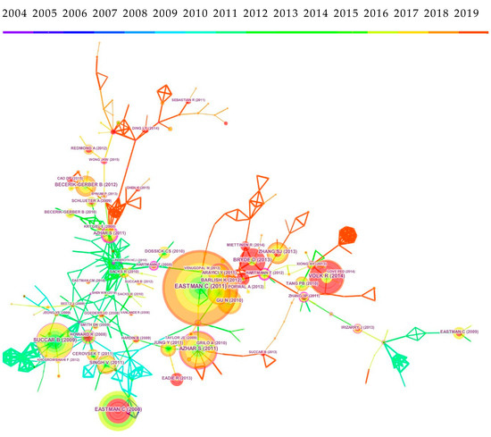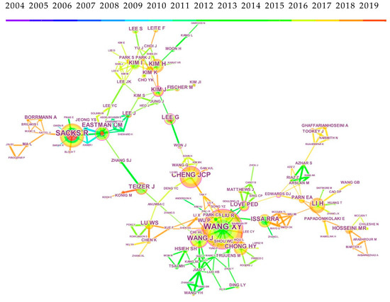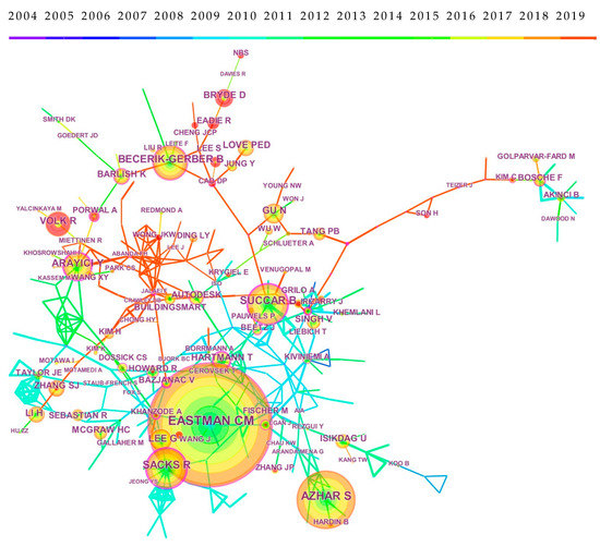 The co-authorship network is shown in Figure 4. Each node represents an author, and links between the authors represent the collaboration established through co-authors in the article. The node size represents the number of publications, and the thickness of the links represents the level of the partnership in a specified year. The colors of the lines (e.g., blue, green, yellow, orange and red) correspond to different years from 2004 to 2019. The bibliographic records of 1455 BIM documents were analyzed with CiteSpace. There were 312 nodes and 336 links for the co-authorship network.