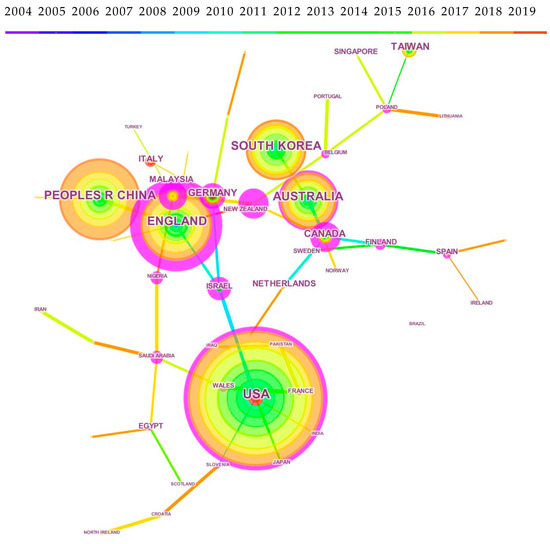 As for citation burst detection, five countries received citation bursts with different strengths at different times. Ranked according to the burst strength, the sequencing is as follows: the United States (strength = 10.49, 2004–2012), Israel (strength = 5.31, 2009–2010), Germany (strength = 279 4.01, 2009–2011), Italy (Strength = 3.65, 2017–2019), and Finland (strength = 3.26, 2009–2015).