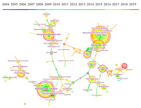 In terms of citation burst, seven research institutes have received varied strength of citation burst at different times. According to the burst strength, the sequences were Georgia Institution of Technology (strength = 6.63, 2006–2012), Technion-Israel Institute of Technology (strength = 6.57, 2009–2013), University of Salford (strength = 5.69, 2007–2012), University of Newcastle (strength = 4.26, 2011–2013), UCL (strength = 3.62, 2017–2019), Virginia Polytechnic Institute and State University (strength = 2.98, 2011–2013) and University of Reading (strength = 2.98, 2013–2014).