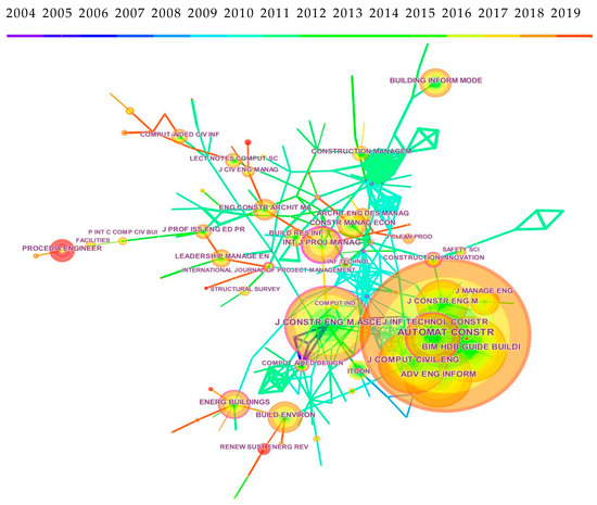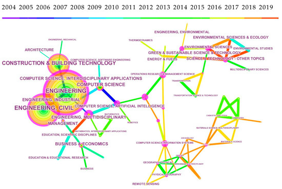 Each journal publication from Web of Science Core Collection database was assigned to one or more subject categories based on relevant journals. A network of subject category research was generated with 62 nodes and 135 links. This network was used to analyze the emerging trend of BIM research, as shown in Figure 7.