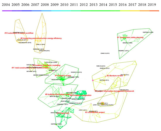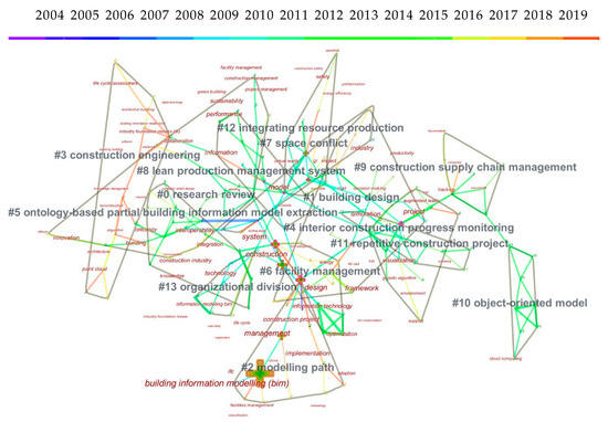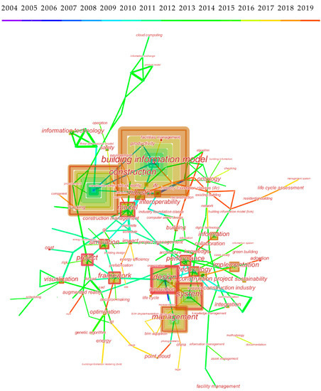 The time span settings were from 2004 to 2019 for BIM bibliographic records. Each year was selected as a time slice and 16-time segments were obtained. The Cosine algorithm was selected for the correlation strength of network nodes. The threshold of time slice was set to 50, i.e., the first 50 (Top 50) were extracted. Finally, redundant links were removed by Pathfinder in-network pruning, as recommended by Chen and Morris [22]. Moreover, the corresponding node types were selected, and the corresponding scientific knowledge map was drawn according to the research needs.