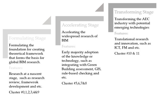- According to the scientometric analysis, research publication in BIM topic started in 2004. The global BIM research, which is distinguished into 12 clusters, has gone through three key stages, namely formulating stage, accelerating stage and transforming stage: