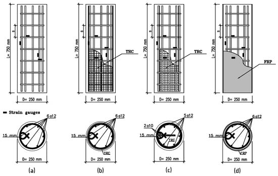 Geometrical and reinforcement properties of all HSC-tested columns. (a) TSR-confined specimens, (b) specimens with TRC wrapped externally around the reinforcement cage, (c) specimens with TRC located around the inner perimeter of the reinforcement cage, (d) FRP-TSR confined specimens.