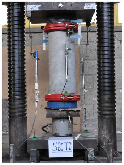 All column specimens were tested under compressive loading using a hydraulic press with load-controlled capabilities and a maximum load of 5000 kN. The experimental program was performed at the National Building Research Institute laboratory at the Technion – Israel Institute of Technology. The test setup is shown in Figure 3. Around the mid-height of the specimens, strain gauges were installed as follows: two on two longitudinal bars and two hoops, two on the fiber-textile of TRC-TSR specimens (before concreting), and two on the FRP of FRP-TSR specimens. Four linear variable displacement transducers (LVDTs) were used to measure the axial displacement of the specimens during testing—two LVDTs with a gauge length of 575 mm located on the specimen and two with a gauge length of about 1000 mm measuring the displacement between the two press loading plates. Steel collars were installed at the two ends of the specimens to prevent local failure and to ensure failure at the instrumented zone of the specimens. Sand capping with steel-retaining cups (specially produced for the tests) were used at two ends to ensure uniformity of the loading.