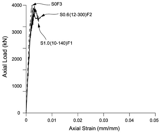 The axial strain versus axial load curves are presented in Figure 4 and Figure 5 and the appearance of all specimens after testing is shown in Figure 6. Table 3 presents measured featured loads and strains of all specimens. The experimental results are discussed in the following sections.