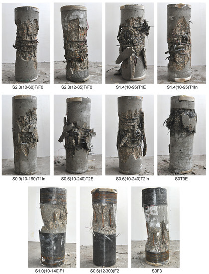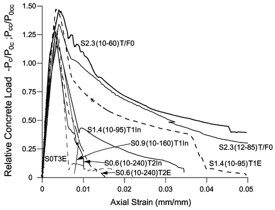 Figure 7 and Figure 8 show the normalized stress–strain curves of all specimens. The curves were derived based on a similar technique performed in previous studies [1,21,22]. The overall behavior in the figures show that TRC-TSR specimens with the same textile fiber mesh wrapped externally and internally around the reinforcement cage behaved in a similar way. In one case, the external mesh gave a better ductile behavior [compare S1.4(10-95)T1E vs. S1.4(10-95)T1In]. It is shown in Figure 7 that the behavior of specimens S2.3(10-60)T/F0, S2.3(12-85)T/F0, and S1.4(10-95)T1E with TSR amount and one layer of TRC, is comparable in terms of axial strength and ductility. It should be noted that the amount of TRC was chosen to provide a similar maximum equivalent lateral passive pressure. The effect of TRC on the strength of the specimens is well-observed. For example, compare the confined strength of specimens S0.6(10-240)T2E () and S2.3(12-85)T/F0 (). However, in terms of ductility, the behavior of the latter specimens are not similar. Thus, the effect of the TRC confinement on the ductility enhancement is not as effective as the TSR confinement. This is a result of the low actual maximum tensile strain reached by the TRC (linear-elastic material) in all TRC-TSR confined specimens, [], compared to the high strains that can be reached by the TSR (elastic-perfectly plastic material). Thus, it is recommended to further examine higher amounts of TRC combined with TSR in order to reach a similar ductile behavior as the TSR’s only confined specimens.
