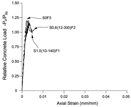 Figure 8 shows that in terms of axial strength, the FRP-TSR specimens obtained the highest maximum loads. This is attributed to the prevention of the cover spalling off by the FRP action. However, in terms of ductility, the FRP-TSR specimens were unable to sustain loads after the rupture of the FRP (at ).