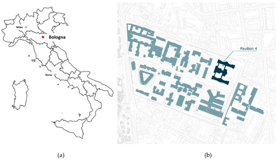 (a) Location of Bologna city; (b) location of the case study building within the Saint Orsola-Malpighi polyclinic hospital.
