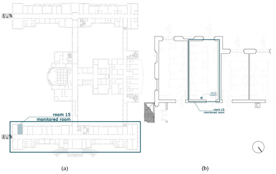 (a) General plan of pavilion four with the location of the test room (bedroom 15) in its own sector; (b) location of the sensor in the bedroom.