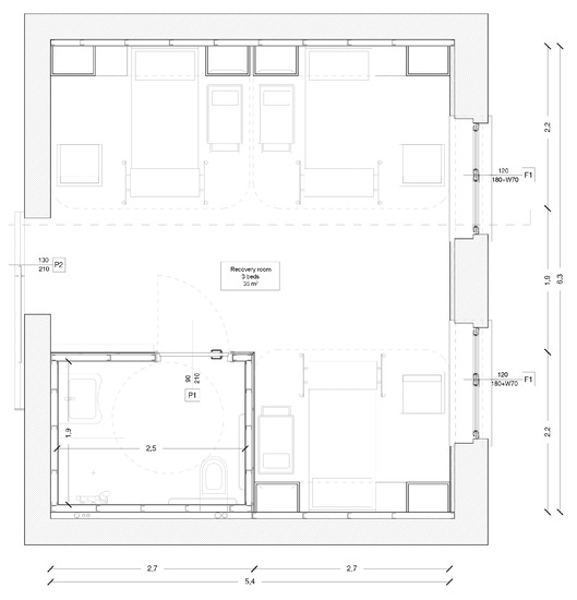 Once the starting conditions were carefully analyzed it was agreed that new bedrooms are obtained merging two adjacent rooms (in the test room n° 14 and n° 15). Figure 4 provides the final proposed layout of the new typical bedroom. The total number of bedrooms will be balanced by moving other functions in the middle of the ward or in the central body of the building.