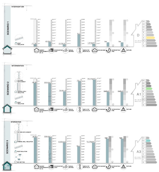 Figure 5 reports and compares intervention costs, yearly cost savings, Simple Pay Back value, works duration, impacts and energy performance level associated to each scenario. The Simple Pay Back (SPB) values following standard EN 15459-1 [24] with an inflation rate of 3% that includes the energy inflation rate and discount rate 1.5%. Cost of materials following price list by Chamber of Commerce of Bologna and energy cost by ARERA the Italian Regulatory Authority for Energy, Networks and Environment.