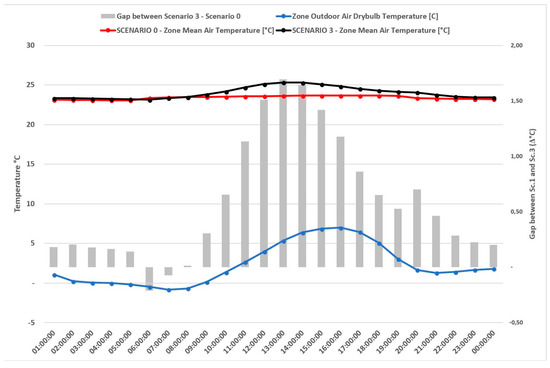 The graph, in Figure 7, shows the effects that retrofitting actions of scenario 3 would produce if completed. It can be noticed that, assuming the heating system as a constant, in scenario 3 operative temperature is increased by +1.5 °C during the central hours of the day compared to starting position (scenario 0). It has to be remembered that set-point temperature in hospitals is 22 °C ± 2 °C. Furthermore, looking at the outdoor temperature trends, it can be argued that this increase is not simply influenced by possible solar gain but it takes also into account possible internal gain.