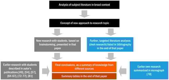 The layout of the research work is presented in Figure 1. It shows the duality of the research approach, which has been also demonstrated in the structure of the article, i.e., the “gray path” (on the left) presents the pilot study with the participation of students, and the “blue” path (on the right) presents the expert research documented by the author’s own publications, which are listed in the bibliography. Both sources combine to obtain the synthesis of knowledge.