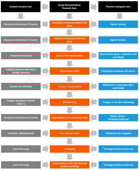 Diagram of the research methodology presents the design thinking method step by step (red path). Additional explanations are presented on left and right side. On the right (grey path) you can see how research activities have been realized on indicative level, and on the right (blue path)—how it should be conducted on investigative level, when the full design thinking methodology in cooperation with sociologist and psychologist should be applied.