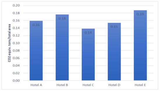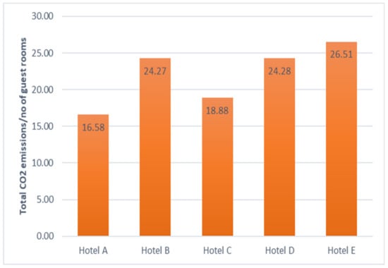 In order to conduct a fair comparison between the hotels, total carbon emissions of the hotels were normalized using the proxies of the total floor area and the number of guest rooms. Accordingly, emission levels of Hotel E were higher than those of the other hotels, followed closely by hotel B (Figure 3). Furthermore, emissions of hotel E remained above the other hotels when normalized using the guest rooms (Figure 4).