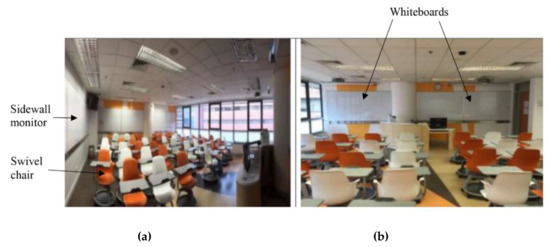 Conventional teaching in universities is based on one-way delivery of knowledge from teachers to students [8]. The rapid development of information and communication technologies, together with the advent of the constructivism learning paradigms, have generated a pedagogical shift from conventional one-way teaching to more active and collaborative learning environments [7,9]. Classroom configuration should facilitate teachers to engage with individual students by moving freely around the classroom [10]. Lam et al. [11] identified such learning activities as group debates, forum discussions, and teamwork, which can best be carried out in small discussion groups in learning spaces with lightweight and movable wheeled chairs, allowing flexible seating configurations. A computer network is an effective means of enabling students to access online learning materials, even with real-time interactive communication that can offer a large variety of teaching approaches for teachers [7,8,12,13]. Teaching spaces are not confined to only formal lecture/classrooms, but extended to the whole campus, including informal learning spaces [8]. Facilities that encourage learners’ active participation and collaboration are increasingly important in learning space design [6,8].